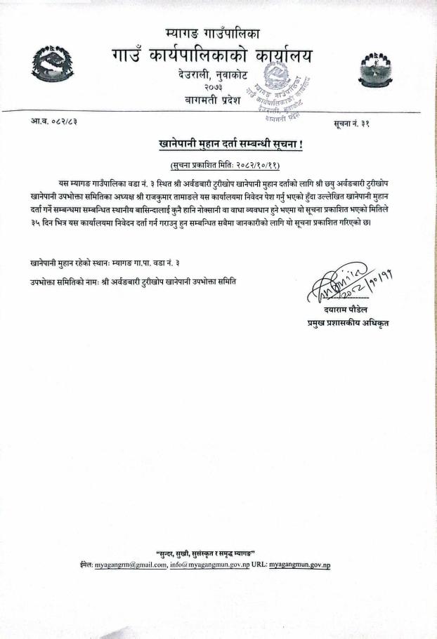 » अर्वङ्बारी टुरिखोप खानेपानी मुहानदर्ता सम्बन्धि सूचना !