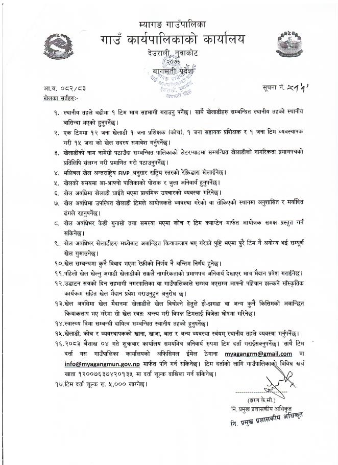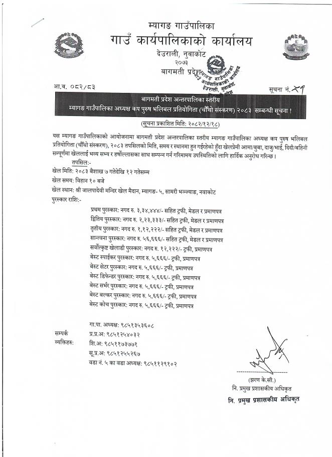 » बागमती प्रदेश अन्तरपालिका स्तरीय म्यागङ गाउँपालिका अध्यक्ष कप पुरुष भलिबल प्रतियोगिता (चौँथो संस्करण) २०८३ सम्बन्धी सूचना !