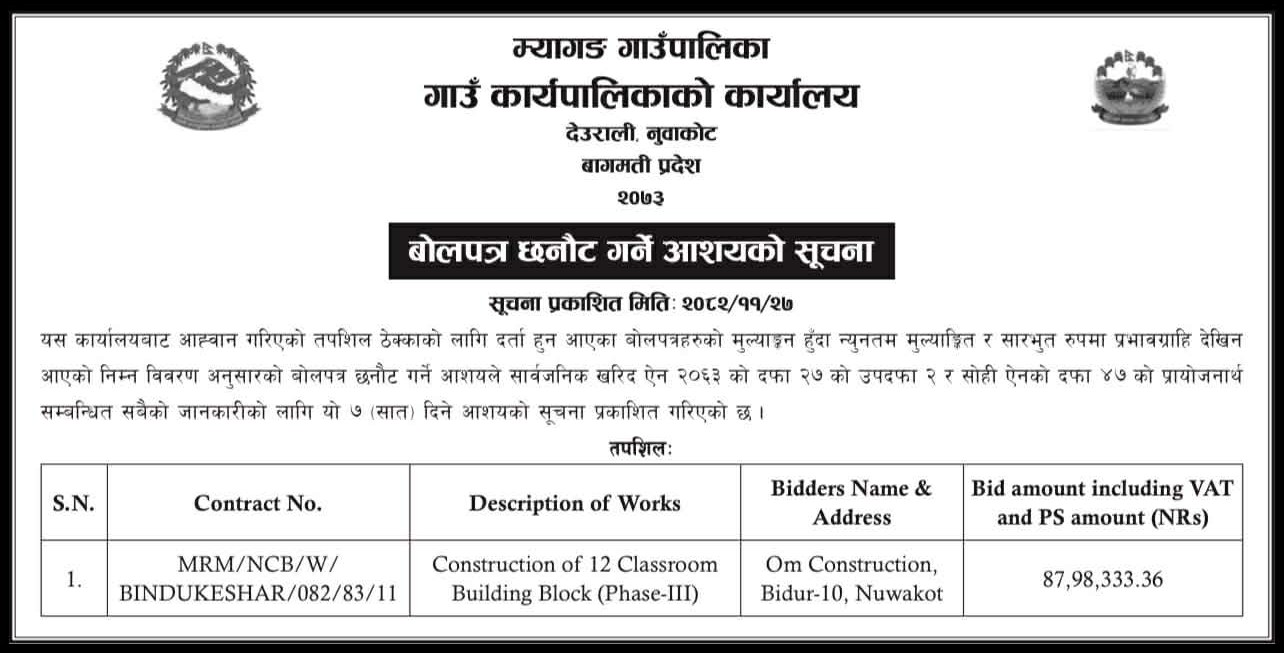 बोलपत्र छनौट सम्बन्धी सूचना !