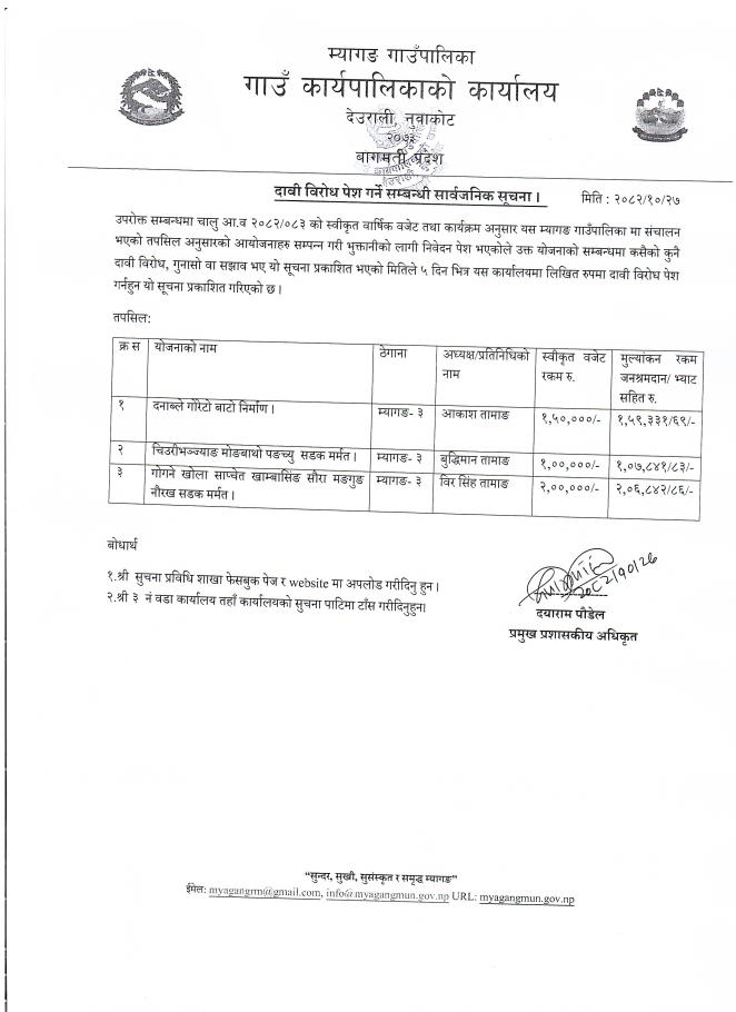 मिति २०८२/१०/१९ गते प्रकाशित दावी विरोध पेश गर्ने सम्बन्धी सार्वजनिक सूचना !