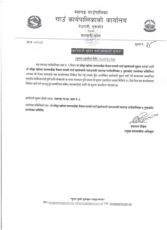 » सोह्रा खोला सल्लाडाँडा मैवल तल्लो गाउँ खानेपानी मुहान दर्ता सम्बन्धी सूचना !