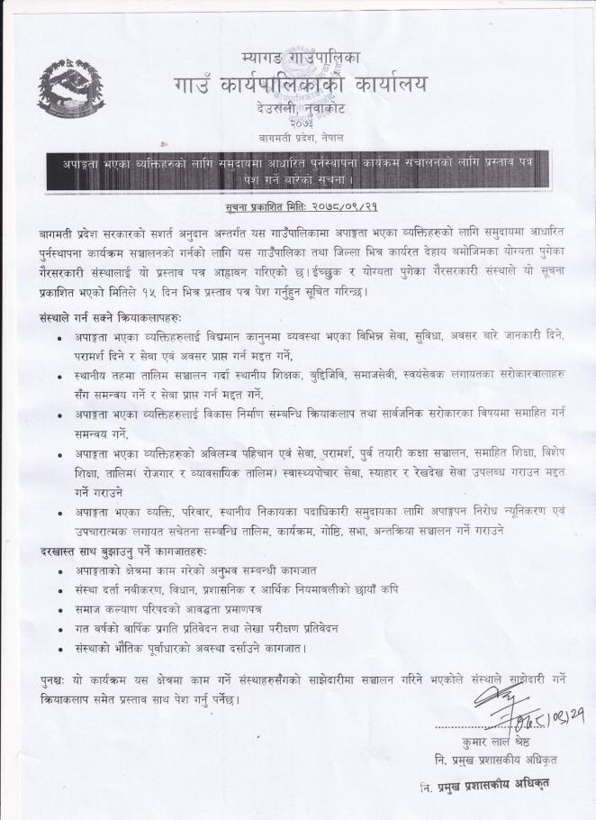 अपाङ्गता भएका व्यक्तिहरुको लागि समुदायमा आधारित पुर्नस्थापना कार्यक्रम सञ्चालनको लागि प्रस्ताव पत्र पेश गर्ने सम्बन्धि सुचना।