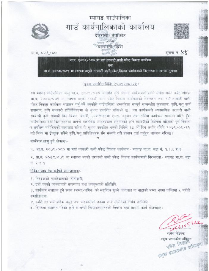 Home » आ.व. 2079/080 मा नयाँ तरकारी बाली पकेट विकास कार्यक्रम तथा आ.व. 2078/079 मा स्थापना भएको तरकाली बाली पकेट विकास कार्यक्रमको निरन्तरता सम्बन्धी सूचना!