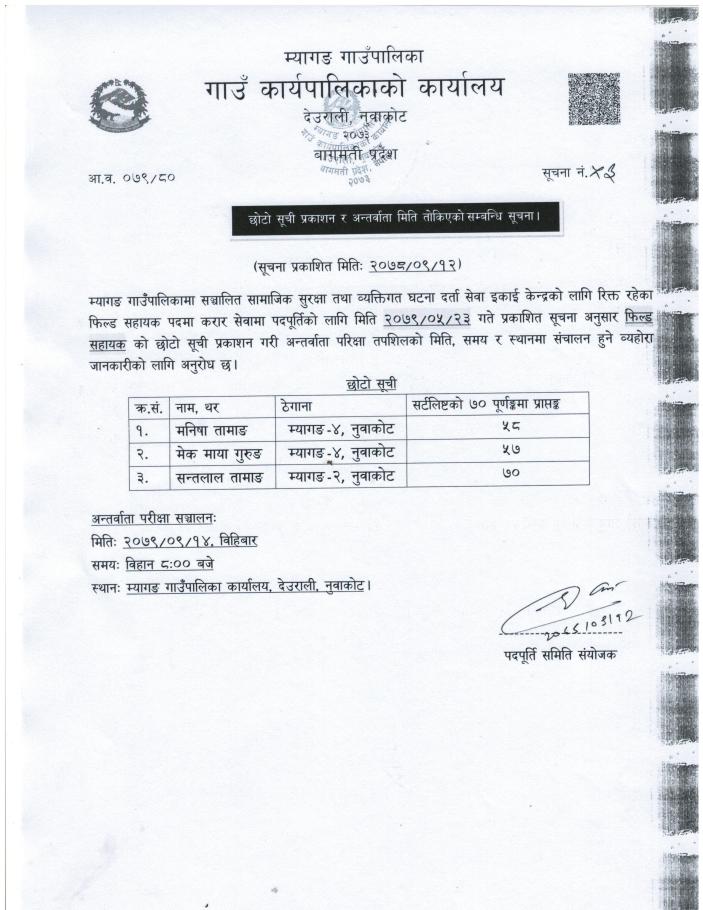 छोटो सूची प्रकाशन र अन्तर्वाता मिति तोकिएको सम्बन्धी सूचना।