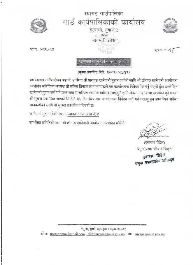 पारादुङ खानेपानी मुहान दर्ता सम्बन्धी सुचना !