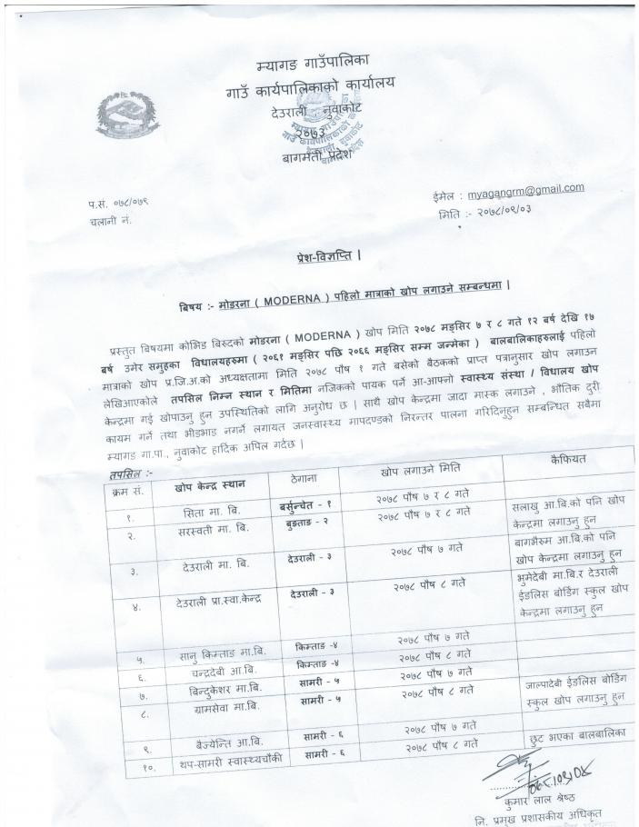 मोडरना (MODERNA) पहिलो मात्राको खोप लगाउने सम्बन्धमा !